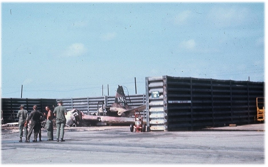 Update: 12 December 2020. CMSgt (Ret) Gary Chaffin, who was at Da Nang with the 366th Civil Engineering Squadron, recalls this attack much as Dick does. He sent this shot (cropped a bit from his original) of 102's remains, taken from a slightly different angle.